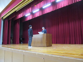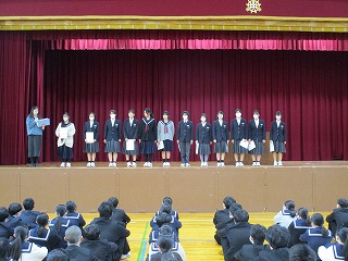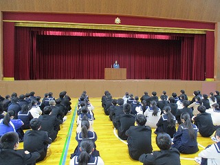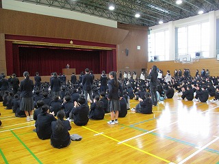 次に、3年生学年主任から、冬季オリンピックでの選手の言葉を紹介し、どのような環境においても今を大事にし、自分を信じて一歩一歩進んでほしいとのお話がありました。