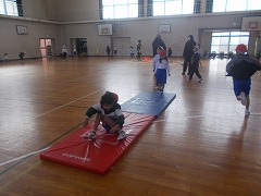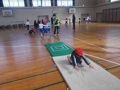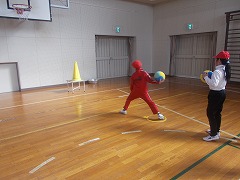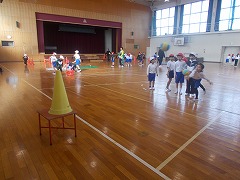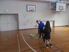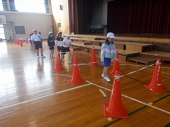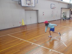 体育の時間には、いろいろな動きをして体を動かしています。今日は、的当て、コーン当て、ゴム跳び、マットの4つに分かれて活動しました。それぞれのコースで楽しみながら活動していました。