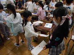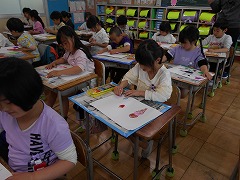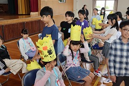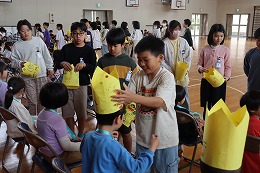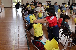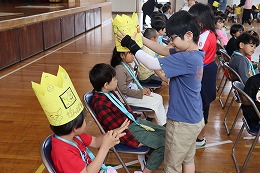 5年生は王冠をプレゼントしました。1年生が喜ぶようにと一生懸命、王冠の絵を描きました。