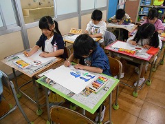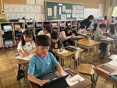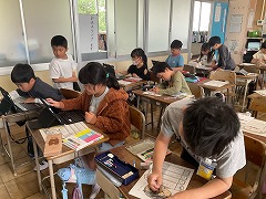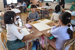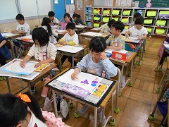 生活の授業では、1年生との学校探検に向けて、各特別教室の看板を作りました。チームの仲間と話し合いながら描き進めることができていました。
