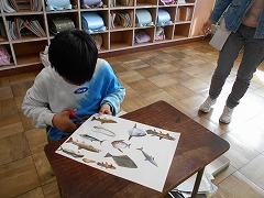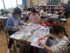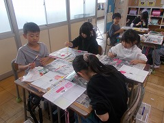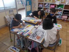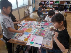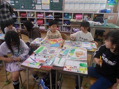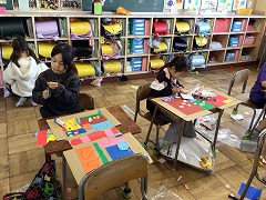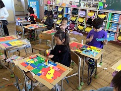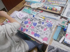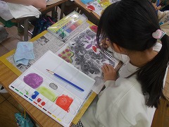 今日の図工は、紙版画の色塗りをしました。絵の具と水の量を調節して、しっかり色がのるように工夫していました。「何色にしようかな」「混ぜたらこんな色になったよ」と楽しそうに活動していました。