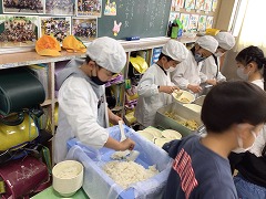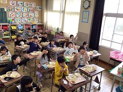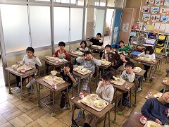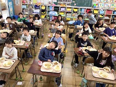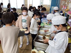 給食の時間には、当番の子は素早くエプロンに着替え、それ以外の子たちがお手伝いをしています。