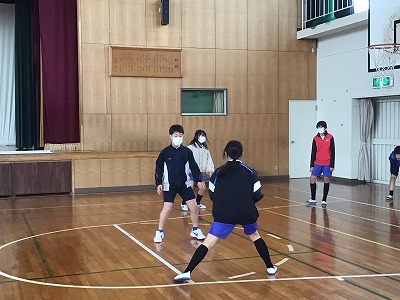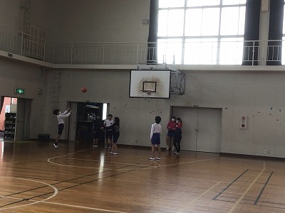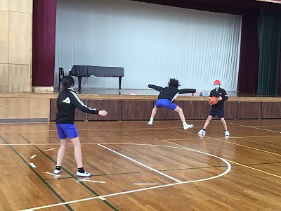 1組は体育の様子を紹介します。バスケットボールの授業に入りました。ウォーミングアップをしたあとに、2対1をしました。ボールを持っている人は、シュート・パス・ドリブルのどれを選ぶとよいかを判断し、ボールを持っていない人は、どう動いたらボールをもらえるのかを判断することを目標に行いました。