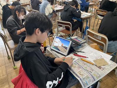 2組は図工の様子を紹介します。彫刻刀を使って彫り進め、色を塗り始めました。自分の思い出が詰まった作品が出来上がりそうです。
