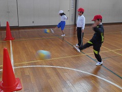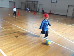 ボールを足の裏でタッチ、ドリブル、的あてなどをしました。