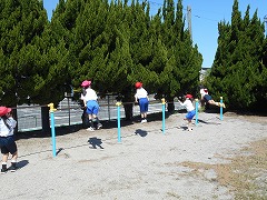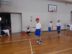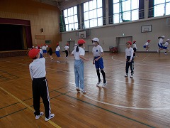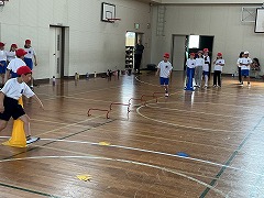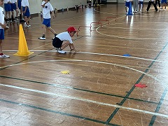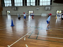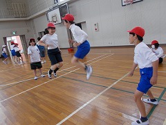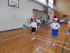 5年生で体づくりの運動をしました。みんなで息を合わせて大縄跳びを行いました。みんなで声を合わせながら楽しく跳んでいました。その後は、障害物リレーをしました。一番の難関はボール運びで、ボールを落とさないように工夫しながら運んでいました。