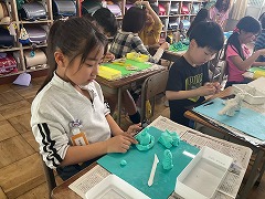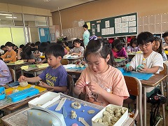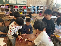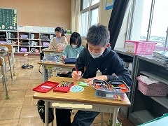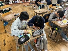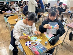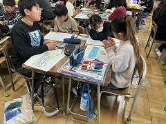 図工の学習では、光が差し込む絵という題材で、光が当たったときにきれいに映るためにはどうしたらよいか考えています。グループで相談し、色々なアイデアをもらって作品をよりよくしようと頑張っています。