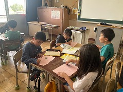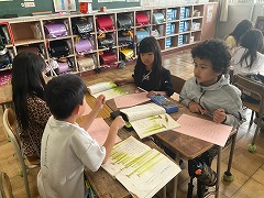国語の時間には、決められた最初の一文と最後の一文から、チームで一文ずつ順につなぎ、三周する間にお話を作りました。