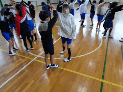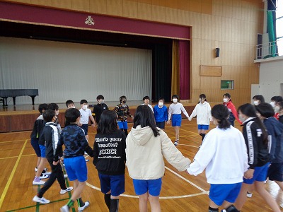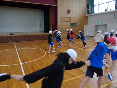 1組は体育の授業の様子を紹介します。今は表現の授業に入りました。ウォーミングアップで手つなぎ鬼をして体を温めました。今日はいろいろなフォークダンスを踊ってみましたが、各国の民族音楽に合わせながら、みんなで楽しく活動できました。
