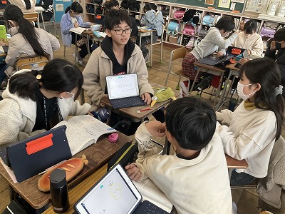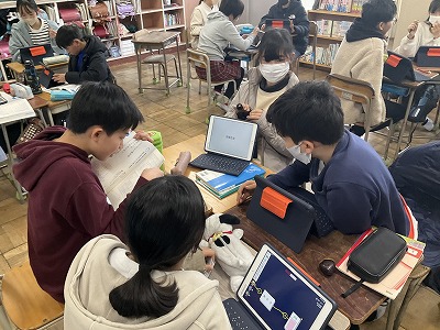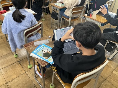2組は国語の様子を紹介します。仮名の由来について学んでいます。漢字からどのように平仮名や片仮名ができたのか、クイズを出し合いながら考えることができました。