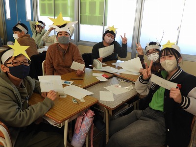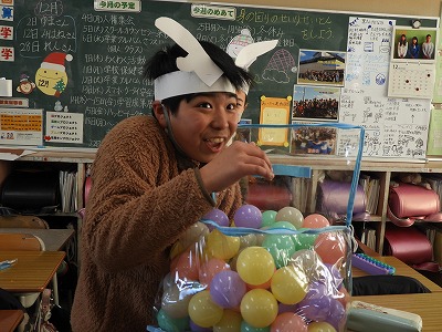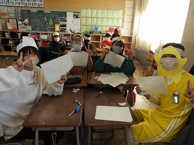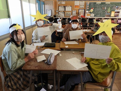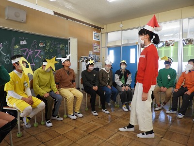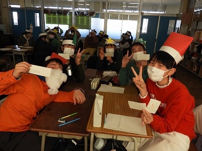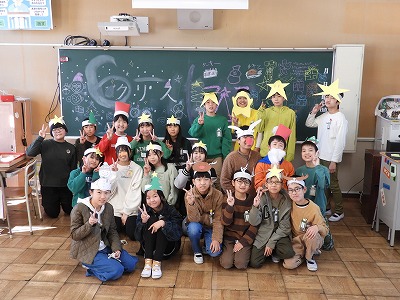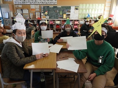 今日の3・4時間目でお楽しみ会(クリスマス会)をしました。みんなクリスマスカラーを意識した服装に、お面などを身に付けてクリスマスの雰囲気を作りました。「連想ゲーム」「ニセ雪合戦」「震源地」「プレゼント交換」どれもみんなで楽しむことができました。あっという間の2時間でしたね。