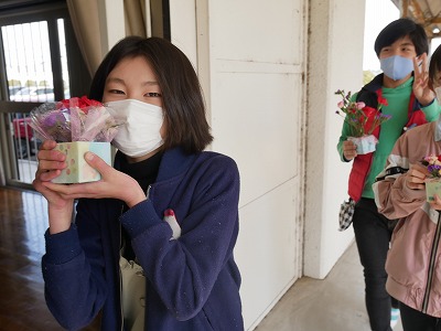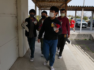 明日の卒業式に飾り、保護者の方にプレゼントするフラワーアレンジメントをしました。