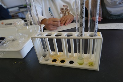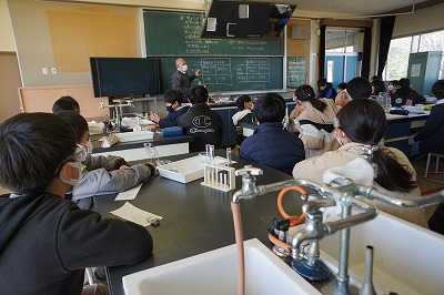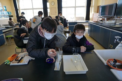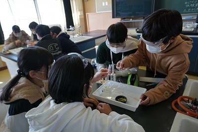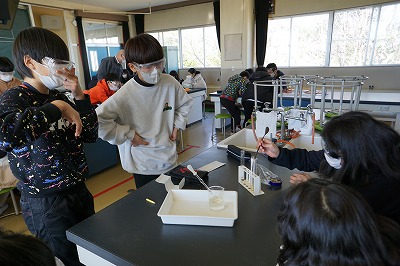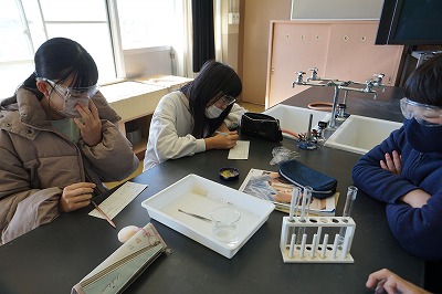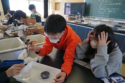 理科では、金属がとけた液から出てきた固体が、もとの金属と同じものかどうか調べました。