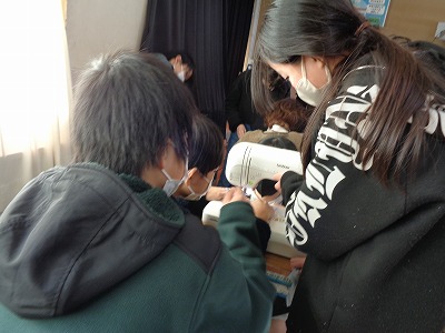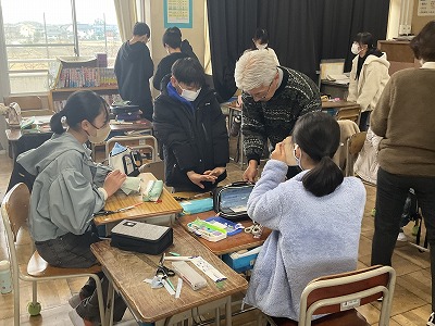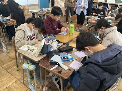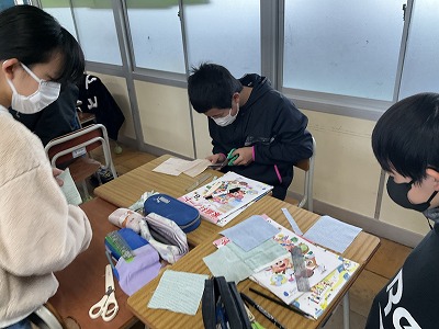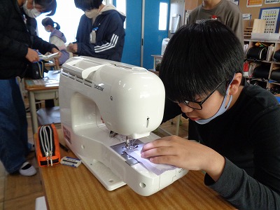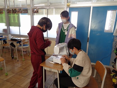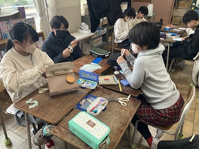 家庭科の様子を紹介します。お世話になった方へのプレゼント作りをしています。これまで習ってきたことを生かしながら一生懸命作っていました。