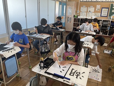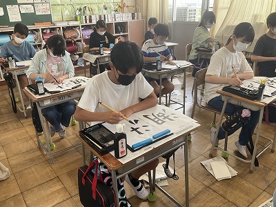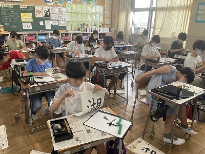 2組は書写の様子を紹介します。3つの部分をもつ「湖」を字形の整え方に気を付けながら書くことができました。文字のバランスだけではなく、書く時の姿勢やとめはねはらいなどにも注意しながら、集中して何度も練習する姿が見られました。