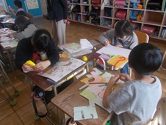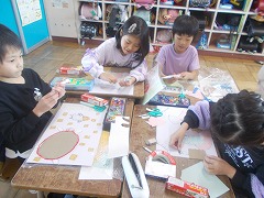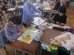 図工では、紙版画をしています。今日は、動物やお花など作りたいものの形に合わせて材料を切り貼りしました。プチプチやざらざらしたものなど、いろいろな材料の組み合わせを工夫することができました。