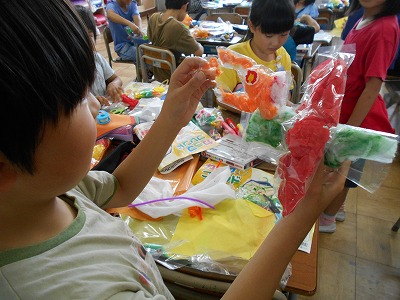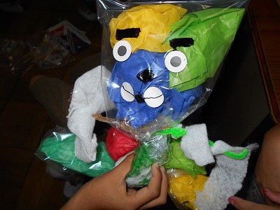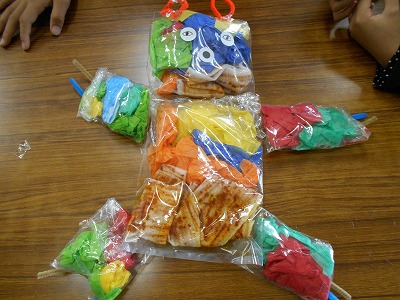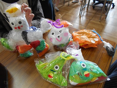 透明の袋に色とりどりの紙を入れてふわふわな形を作りました。