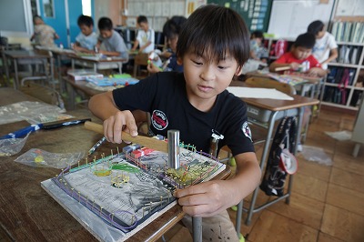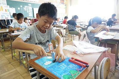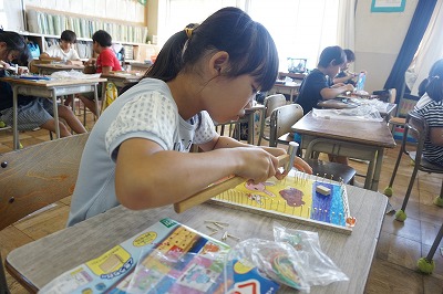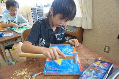 3年生は、木の板に釘を打って、迷路ゲームやパチンコゲームをつくっています。