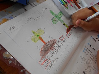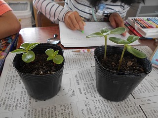 はじめに出てくる子葉とその後に出てくる葉では、形や大きさに違いがあることをみんなで確認しました。