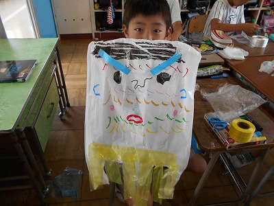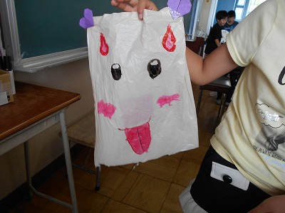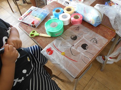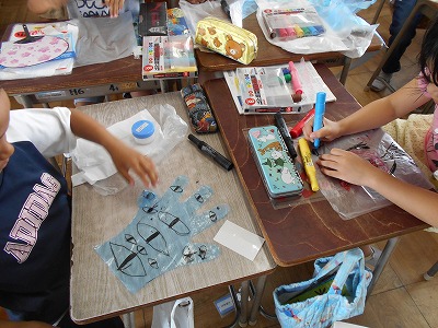 まず、家からもってきたビニール袋に絵をかいたり、飾りをつけました。