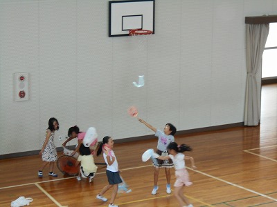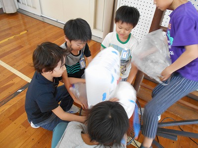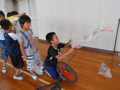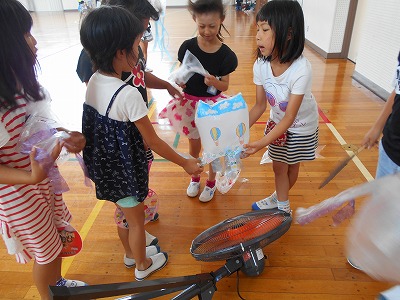 次は、体育館に移動して、扇風機やうちわを使ってうかべました。