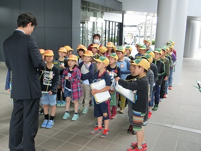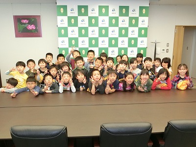 今日は、1時間目に1年生を迎える会があり、2・3時間目には市役所へ校外学習に出かけました。