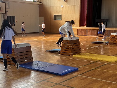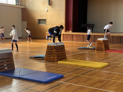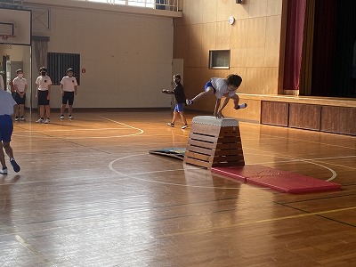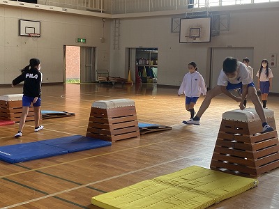 1組は跳び箱運動の様子を紹介します。久しぶりの跳び箱運動ということもあり、戸惑いもあったかもしれませんが、少しずつスムーズに跳んでいる様子が見られました。