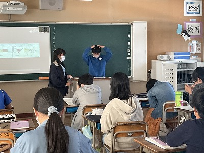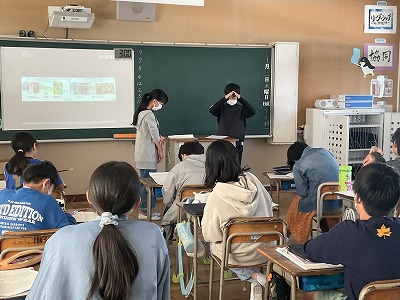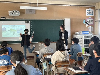 2組は外国語の授業の様子を紹介します。ペアでスピーチを行いました。英語を使って、食物連鎖についてクイズ形式で話しました。感情をこめて伝えたり、ジェスチャーを取り入れたり工夫して発表することができました。