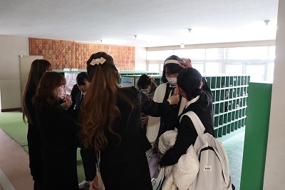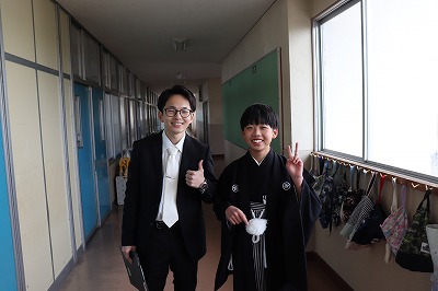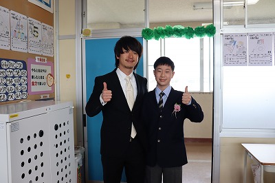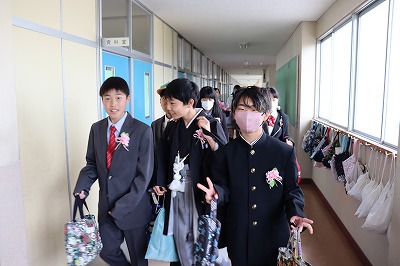 登校するとすぐ、お世話になった先生方に胸花をつけてもらいました。