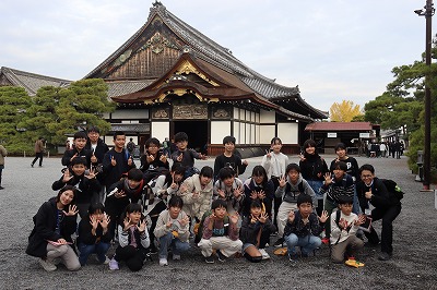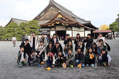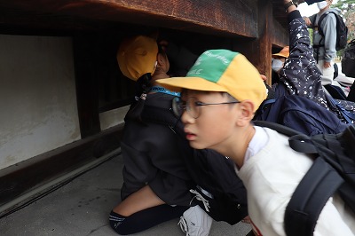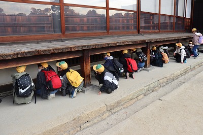 旅館を出発して、二条城の見学をしました。ウグイス張りの廊下を歩いて「キュッキュッ」という音を楽しみながら見学した後、バスガイドさんから廊下から音が鳴る仕組みを教えてもらいました。