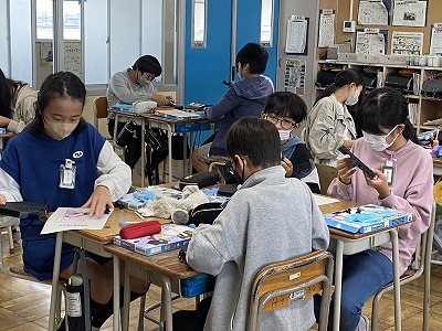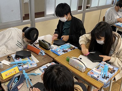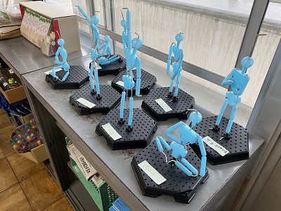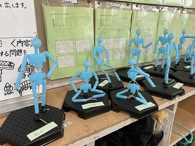 1組は、図工の様子を紹介します。学習成果展で展示する立体の制作に入りました。様々な時代の歴史上の人物の中から、作りたい人物を選んで制作します。今日は心材を曲げて形を作りました。
