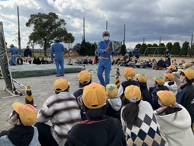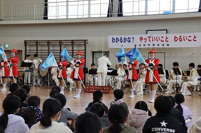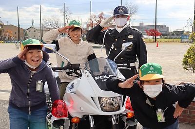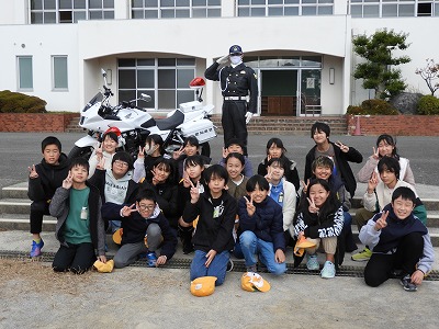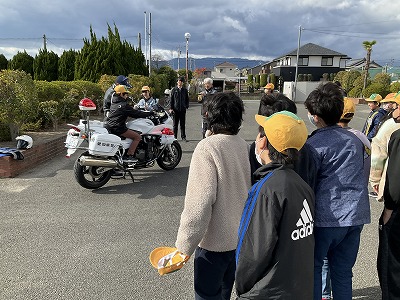 2・3時間目は、交通安全教室がありました。愛知県警察音楽隊の演奏を聞いたり、自転車の乗り方など交通安全に関するお話を聞いたりしました。最後は、パトカーや白バイと一緒に写真も撮りました。