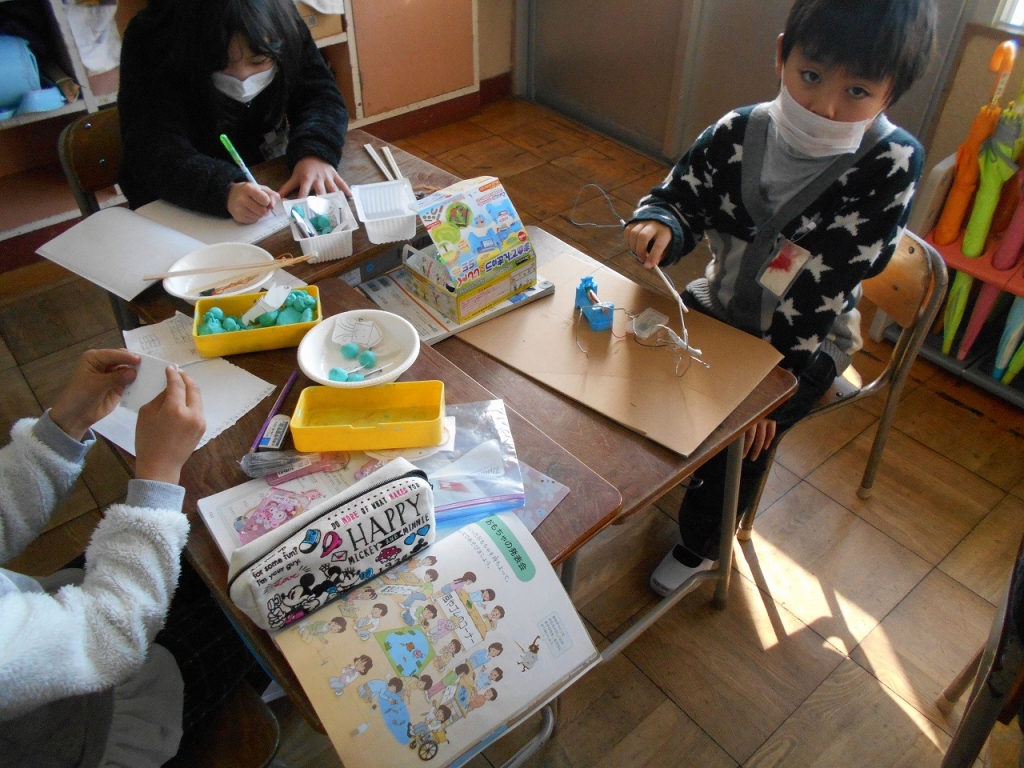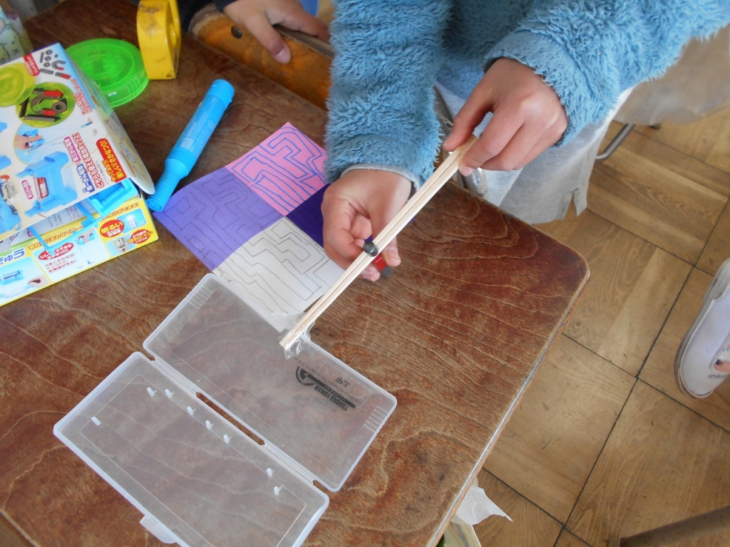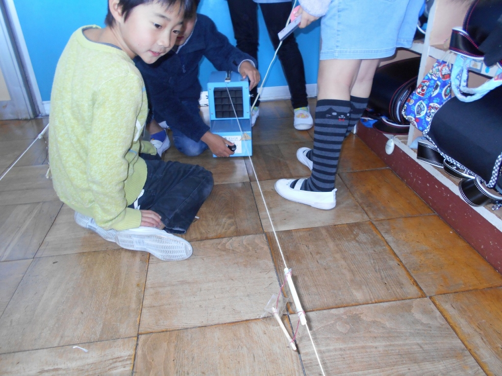風やゴム、電気、磁石の働きを利用したおもちゃをつくることが目標です。