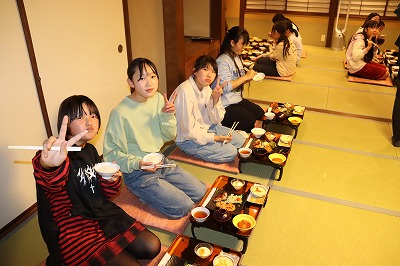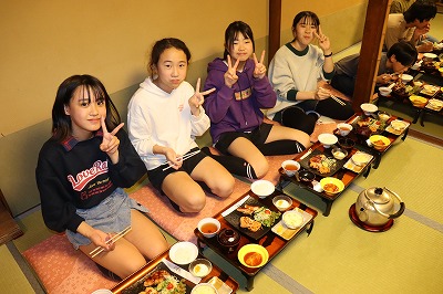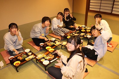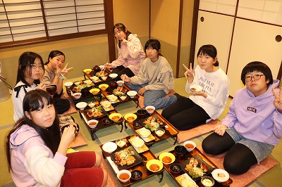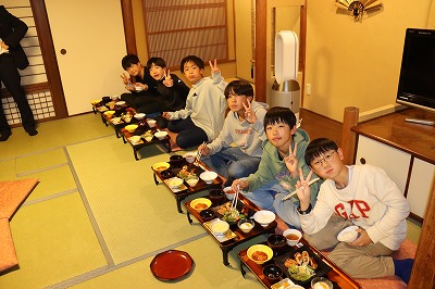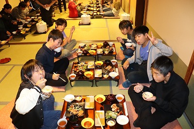 今日は、旅館での様子を紹介します。旅館の方に挨拶をして、おいしい夕食をいただきました。