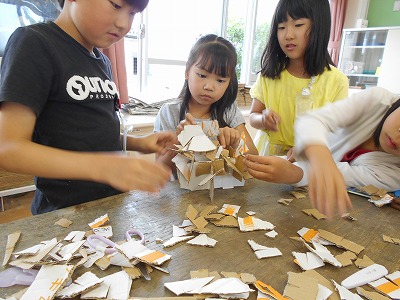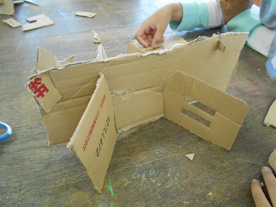 切った段ボールに切り込みを入れて、組み合わせていきました。