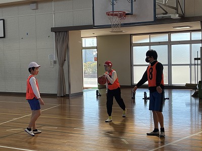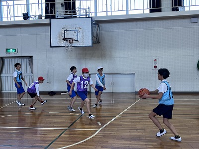 2組は体育の様子を紹介します。バスケットボールに取り組んでいます。練習したシュート、パス、ドリブルを状況によって使い分け試合を進めています。特に、仲間とパスを繋げ合う意識が高く素晴らしかったです。