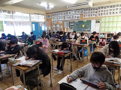 1組は社会の様子を紹介します。アメリカ・中国・ブラジルの3ヵ国について、教科書やタブレット、地図帳を使って調べています。ブラジルのような遠い国でも、日本とのつながりがあることを知り、チームで意見交換をしました。