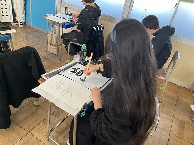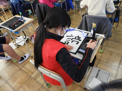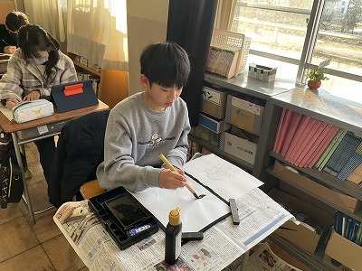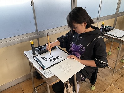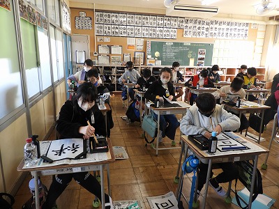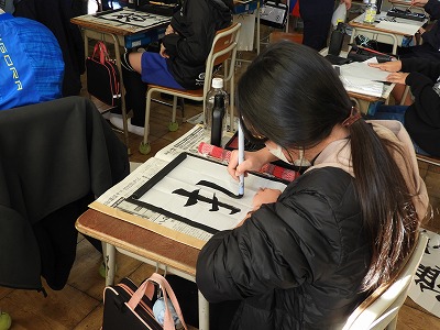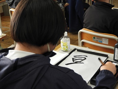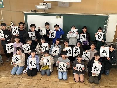 今年の目標を考え、筆を使って漢字一文字で表しました。いつもの書写の授業とは違い、利き手ではない方の手が書いてみたり、イメージに合わせて少し変形させたりして、楽しみながらも思いを込めて書きました。
