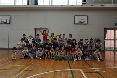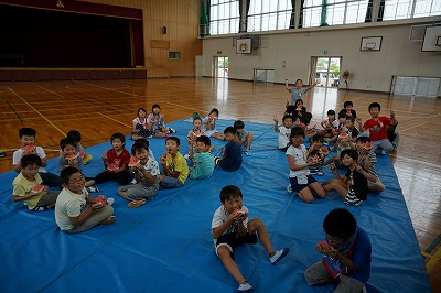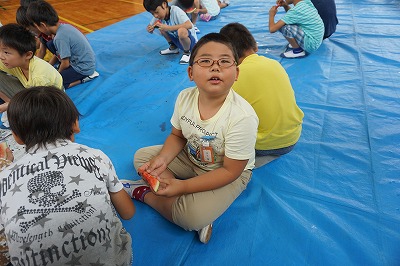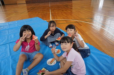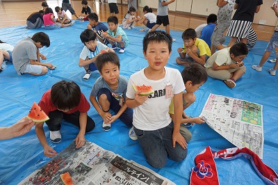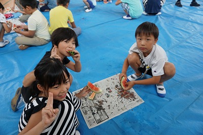夏休み前最終日。自分たちで育てたスイカを使ってスイカわりをしました。