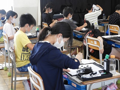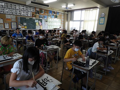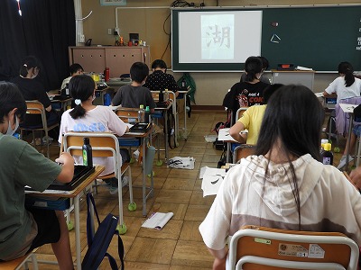 1組は書写の様子を紹介します。3つの部分を組み立てる「湖」に挑戦しました。筆使いやバランス、書き始めの位置に気を付けながら練習しました。