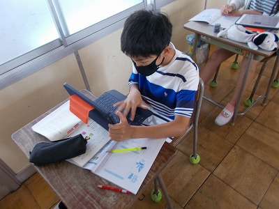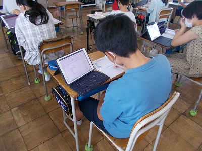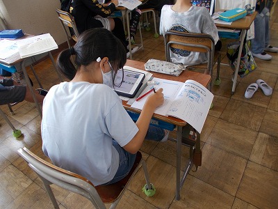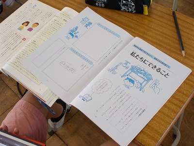 2組は国語の授業の様子を紹介します。具体的な事実や考えをもとに、提案する文章を書く学習をしています。環境問題について調べ、その問題を解決するために「私たちにできること」を考えて文章にまとめています。