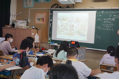大昔のくらしについて、想像図から気付いたことを話し合いました。