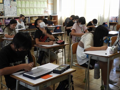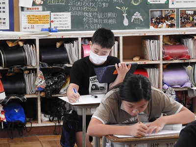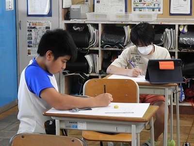 1組は図工の様子を紹介します。「わたしの大切な風景」を描いています。一番お気に入りの場所、一番通った場所などそれぞれが自分の思い出の場所を選びました。まずは下描きの完成を目指しています。