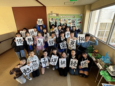 2024年の目標を毛筆で書きました。思い思いの書き方で個性的な作品になりました。