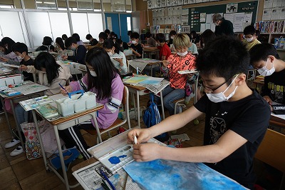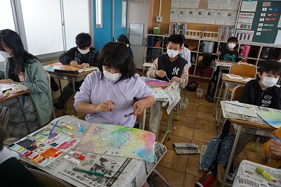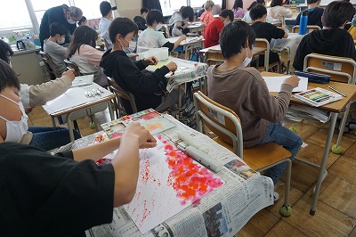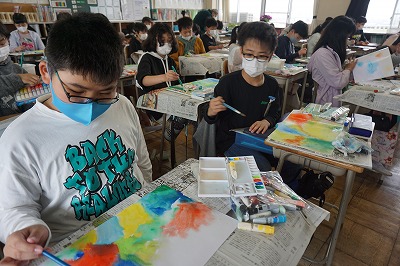 ステンドグラスに見えるように、「ドリッピング」「ドライブラシ」「にじみ」「ぼかし」「点描」などの技法を使って、画用紙を鮮やかにしました。