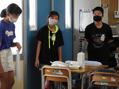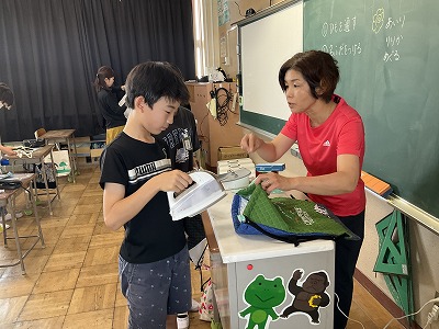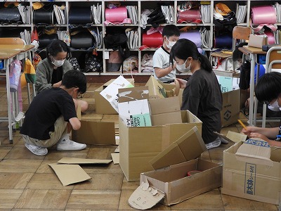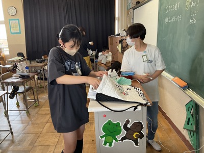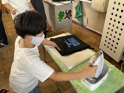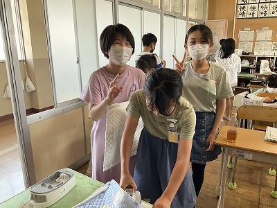 2組は家庭科の様子です。完成したナップザックにアイロンで名札を貼り付けました。自分たちで一から頑張って作ったナップザックは特別ですね。