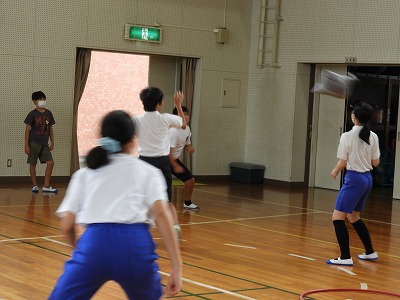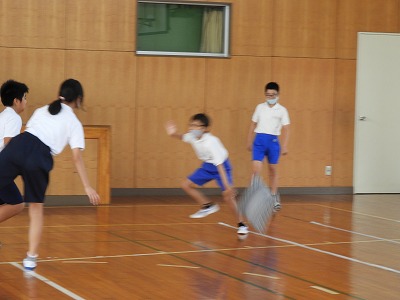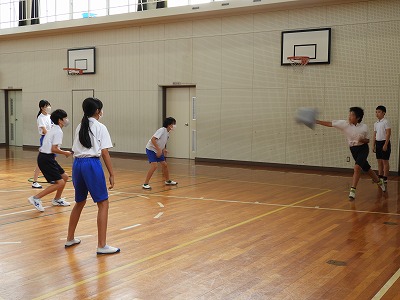 1組は体育の様子を紹介します。ベースボール型のルールを知るために、ボールの代わりにふわふわのクッションを使ってゲームをしました。守備は、どうすればアウトになるのかを考えながら活動しました。