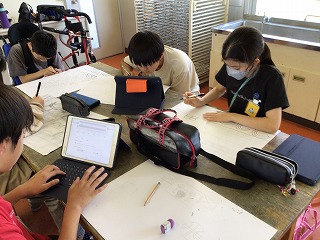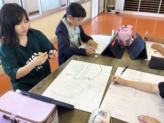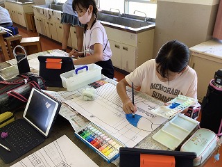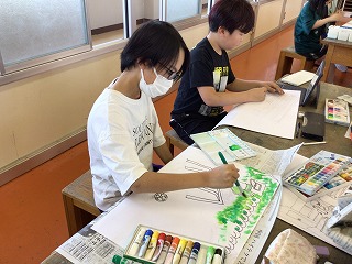 以前撮影した場所を描いています。今日で下描きを終え、絵の具の活動に入る人も出てきました。遠近と色の濃淡の関係を考えて、色を塗っています。