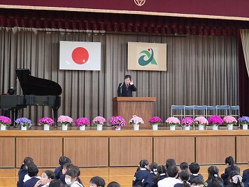 子どもたちは担任発表にドキドキしながらも、「やさしい子 たくましい子 よく考える子」の話をしっかりと聞くことができました。