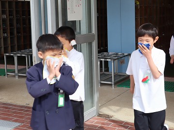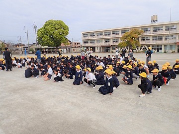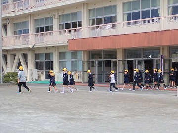 地震発生の放送を受けて、まずは机に潜りました。揺れが収まり、火災発生の放送を聞き、運動場へ避難。子供たちは整然と、慌てず急いで運動場に整列することができました。入ったばかりの1年生もきちんと避難する難することができました。